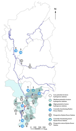 - Municipal entities with the potential for the development of micro hydro power stations: (1) Motyginskiy; (2) Kuraginskiy; (3) Boguchanskiy; (4) Nazarovskiy; (5) Bolʹshemurtinskiy; (6) Karatuzskiy; (7) Abanskiy; (8) Tiukhtetskiy; (9) Novoselovskiy; (10) Sayanskiy; (11) Bolʹsheuluĭskiy; (12) Sukhobuzimskiy.