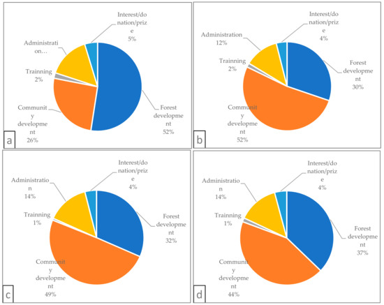 Expenditure pattern of CFUGs 2013/2014 (a), 2014/2015 (b), 2015/2016 (c), and average of all years (d).