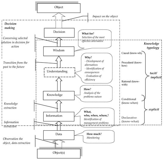 The above literature review shows a fairly high popularity of the DIKW model among specialists in the field of information and knowledge management, who operate with the categories of the virtual world. At the same time, there is an increase in the number of publications on the use of the DIKW model in management, where the categories of the virtual world are inextricably linked with the categories of the real world [14,15,16]. The need for such a connection was noted in 2009 by Fricke, criticizing the classical DIKW model of Ackoff for its isolation from the real world. Discussing the nature of the data, he emphasized that “The pyramid has no basis” [17]. While arguing with Ackoff about the nature of wisdom as the pinnacle of the DIKW hierarchy, Fricke argued that “Wisdom rather refers to the practical use of know-how to achieve the end results” [17]. It should be emphasized that in the Ackoff classical model there are implicit connections between the higher elements of the DIKW hierarchy and the real world, since it states that “Knowledge...provides the ability to control the system” [3], and management means affecting an object. Some elements of the decision-making model are also present in the works of other authors analyzing the DIKW model [18]. However, the relationships of the elements of the DIKW hierarchy with the real world are not sufficiently represented in the literature.