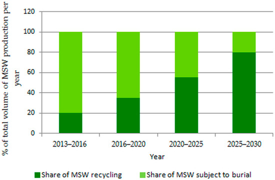 In 2017, 6220.6 million tons of waste were generated within the territory of the Russian Federation, including 58.4 million tons (0.88%) of MSW, 398 kg per capita. The amount of production and consumer waste recovered within this period was 52.5% of the total amount of waste generated, mainly due to industrial waste. The share of recycled MSW in the Russian Federation was about 10%. Burial is the main method of the MSW management in the Russian Federation. The MSW collection in cities is mainly carried out by the mixed container method without prior sorting. In 2017, the volume of the MSW removed to burial facilities amounted to 239 mln m3 (50.9 mln t) or 87% of the total MSW removal; to waste sorting plants 27.4 mln m3 (5.8 million t) or 10%; for neutralization, including removal to waste incineration plants—6.0 mln m3 (0.9 mln t) or 2%. According to Greenpeace [30], Russia has more than 14 thousand large waste landfills with a total area of more than 4 mln ha that increases annually by 0.4 mln ha, which corresponds to the territories of Moscow and St. Petersburg, combined.