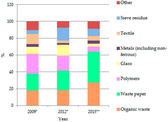 As per Reference [44], waste in Sverdlovskaya Oblast is mostly composed of paper and food organics. Unfortunately, the technology of shredding and discharge of edible waste through municipal water supply sources with further removal by hydrobionts is hardly applied. The presence of a high volume of non-organic components (more than 70%) in municipal waste is typical of cities with rather high social levels and is also indicative of the potential of their recycling [45].