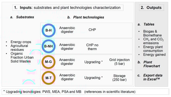 Mass and energy balance of the system may be exported in form of scheme in JPEG format. The complete output of the simulations may be exported in Excel® (Microsoft) (Albuquerque, NM, USA) format. Once inserted, main input information, mass, energy and environmental modules may be run separately and interactively modified. The model also allows the loading of external metadata input files. The structure and main features of the modules are reported in the following.