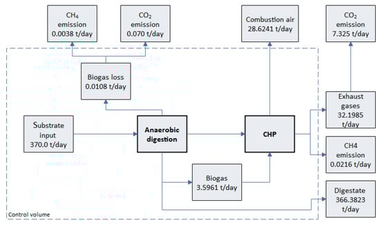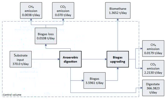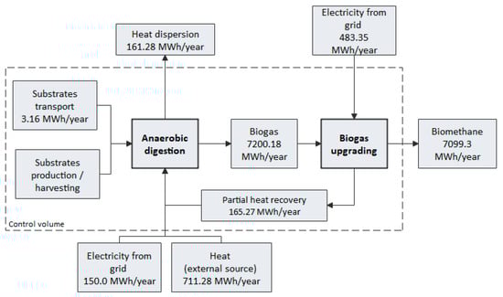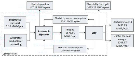 • Thermal energy auto-consumption due to substrates pre-heating and maintenance of the temperature into the digesters is calculated by default as 12.5% or 9.6% of the biogas energy content for an inlet material flow lower or higher than 20,000 t/year, respectively [37]. This value can be customized by the user.