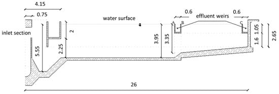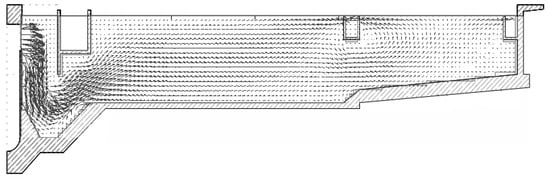 Since the 1970s, simulations of the flow field in rectangular sedimentation tanks have been carried out [,,,,,]. Research activities have been focused on the behavior of sedimentation and flotation of activated sludge in turbulent flows, mainly with numerical models able to simulate detailed geometries and boundary conditions, on the structure of inlet and removal process. The numerical models relative to sedimentation tanks operating in conditions of uniform density can be distinguished mainly for the adopted model of turbulence; for the choice of the boundary conditions; for the discretization method; and for the procedure used in the numerical resolution. The precursor in flow fields modeling in primary sedimentation tanks was the author of []. In his work, the turbulent viscosity was calculated on the base of the Prandtl’s theory on the mixing length. In 1981, the author of [] proposed a model for primary sedimentation distinguishing the velocity field from the concentration one and introduced the hypothesis that the two fields can be solved separately (not coupling hypothesis). They adopted a finite elements technique to determine the flow and calculated the eddy diffusivity coefficient () through the turbulent kinetic energy “k” and its viscous dissipation “ε” (k-ε model proposed by []). The k-ε model is the most used turbulent model due to its robustness and reasonable accuracy for the prediction of turbulent flow in secondary sedimentation tanks [,,,,,,,,].