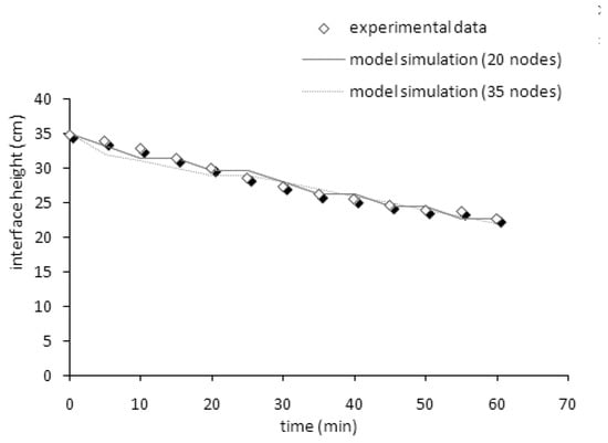Such a model was applied to a sedimentation column test performed on a real sludge, and the results in terms of comparison between the position in time of the experimental interface height and the simulated one are shown in Figure 4.