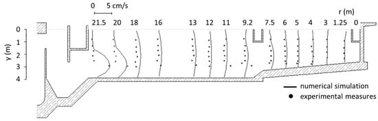 A representative test case is shown in Figure 6, where measurements and numerical simulations of the horizontal velocity profiles are compared. The agreement between experiments and numerical model is quite good, although the values calculated by the model in the central zone of the basin are quite higher than those observed at the field. This might be due to the presence of settled sludge, which can modify the actual section.