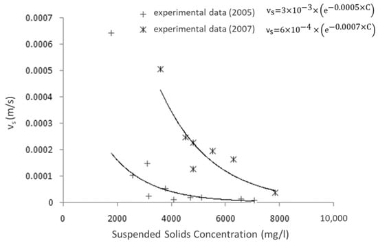 A series of batch-settling tests were conducted, and the results (summarized in Figure 7) show that the exponential formula can be successfully fitted to experimental data obtained at concentrations higher than 2000 mg/l.
