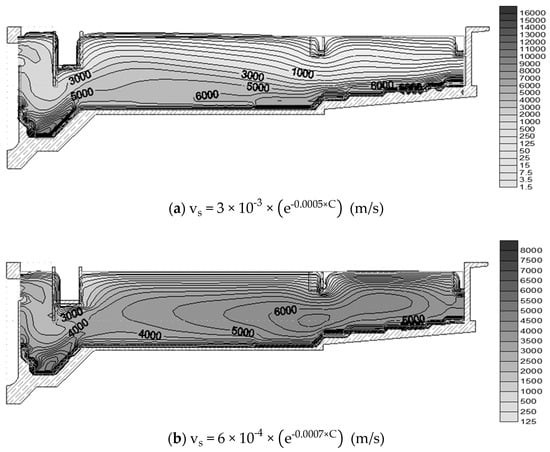 Several hypotheses are generally encountered in the literature [] to allow for an easier numerical solution. One consists of the so called “rigid lid” approximation [,,,], which can be used thanks to the low values of the velocity.