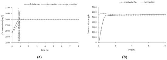 Many studies were carried out to investigate the role of the reaction baffle position on the performance of the sedimentation unit [,,,,]. In particular, the author of [] proposed a numerical model for estimating the velocity field and suspended solids distribution in a secondary circular clarifier with density differences. The model predicted an important phenomenon known as the density waterfall that occurs for large radius baffles. A comparison of the solid’s concentration distribution for a tank with a small skirt radius shows that this one reduces the density waterfall effect and significantly improves the clarifier performances.
