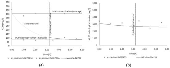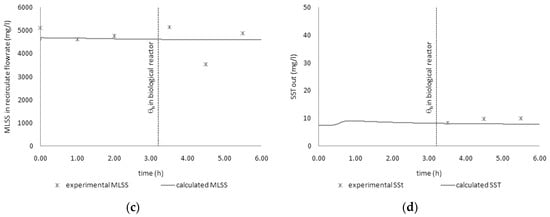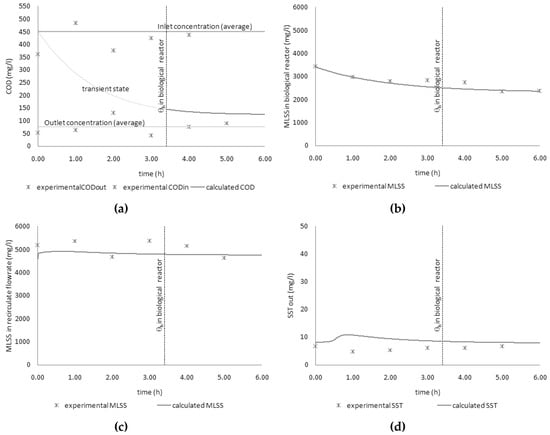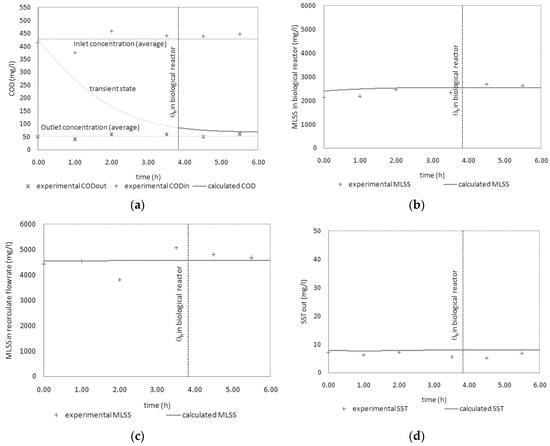 Campaign 2. The values of the kinetic parameters obtained in the first campaign were then also used in this second test. In the following graphs, the numerical simulation results vs. the experimental values for COD (Figure 14a) and TSS (Figure 14b–d) are shown.