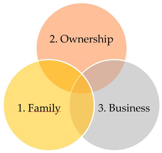 An excellent approach to the reality of the family business and its definition is found in the well-known “Three-Circle Model” []. In this model, the FB is explained from a systemic perspective. The Family Business System in turn is made up of three subsystems: Family, Ownership and Business. Before this approach, only the study of two subsystems had been considered: the family and the business. In the Three-Circle Model, each subsystem is represented by a circle that overlaps at some point with the other subsystems. Thus, each person that forms part of the system could form part of one or various subsystems at the same time. To a large extent, this relationship explains the complexity of the relationships that may exist in the FB. This is because the priorities of each member of the system change depending on their placement within it, as can be seen in Figure 1.