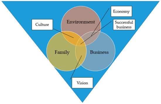 The principal objective of this research is to develop a model that represents the small and medium-sized family business system, taking as a basis the existing theories on this type of business and in the field of management. To this end, a conceptual model was constructed based on a review of the literature, which is adapted to the reality of the small and medium-sized family business in the Mexico City Metropolitan Area and its later validation. The new model was built starting from the Three-Circle Model, but based on the reality of small and medium-sized family businesses in the aforementioned area of Mexico, which are rarely quoted on the stock exchange and in the majority of cases do not have external financial backers, which is the reason why the subsystem of ownership or property is not included. The Business, Family and Environment (BFE) Model is a variation on the Three-Circle Model [], which is more focused on larger-sized companies. The variation of the proposed model is because the Mexican family-owned SME does not usually have shareholders outside of the family and, in many cases, does not have the levels of specialization in the operation and the quality of human capital that a larger-sized company has. In Figure 2 we can see the model graphically: