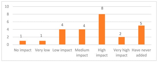 Figure 5 shows that in eight of the 25 cases (32%), participants indicate that the relevance of the impact on the business from incorporating tools to improve their relationship with the environment is high. Eight percent (two of 25 participants) even consider the impact to be very high. Sixteen percent (four of 25 participants) consider that the impact has a medium level, and only six participants consider that the impact from taking these actions is low, very low or null. It is important to point out that five of the 25 participants (20%) indicate that they have never incorporated these types of tools.
