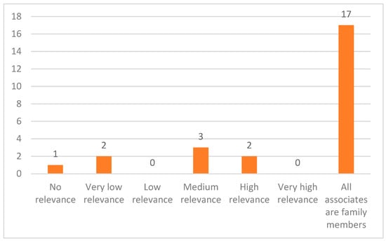Figure 6 shows that in 17 of the 25 cases (68%) the relevance on business performance from new associates who are not family members joining and/or leaving the company is null owing to the fact that, as can be seen in the graphic, the majority of the businesses surveyed do not have shareholders who do not form part of the family.