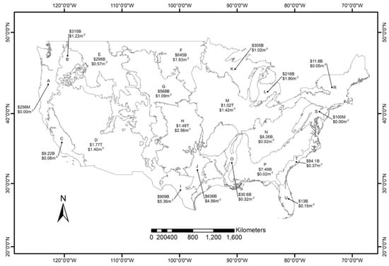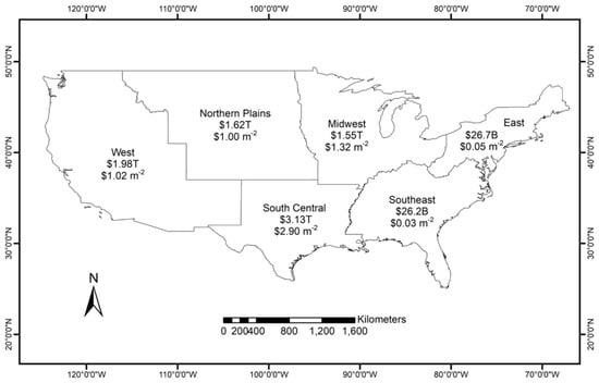 The U.S. Department of Agriculture (USDA) characterizes Land Resource Regions (LRRs) by their geographically corresponding major land resource areas (MLRAs) and uses capital letters to denote agricultural markets (e.g., A, B, C, D, etc.; see Table 6 notes). In the U.S., LRRs are divided into 28 localities. However, the study area (contiguous U.S.) comprises only 20 out of the 28 LRRs. The LRRs with the highest (midpoint) SIC values were: 1) D—Western Range and Irrigated Region ($1.77T), 2) H—Central Great Plains Winter Wheat and Range Region ($1.49T), and 3) M—Central Feed Grains and Livestock Region ($1.02T) (Table 6, Figure 2). When normalized by area, the LRRs were ranked: 1) I—Southwest Plateaus and Plains Range and Cotton Region ($5.36 m−2), 2) J—Southwestern Prairies Cotton and Forage Region ($4.56 m−2), and 3) H—Central Great Plains Winter Wheat and Range Region ($2.56 m−2) (Table 6, Figure 2).