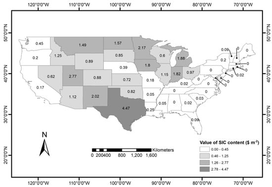 For example, for the State of Iowa, Guo et al. (2006) [] reported midpoint SIC storage and content numbers of 167,537 × 104 Mg and 11.7 kg∙m−2, respectively. Using these two numbers together with a conversion factor for SIC to CO2 and the EPA dollar value for the SC-CO2 results in a total SIC value of $2.58 × 1011 (about $0.26T or 0.26 trillion U.S. dollars) and an area-normalized SIC value of $1.80 m−2, respectively.