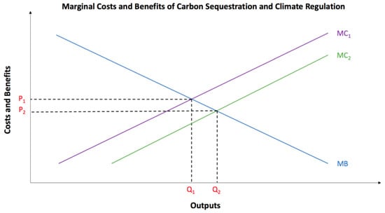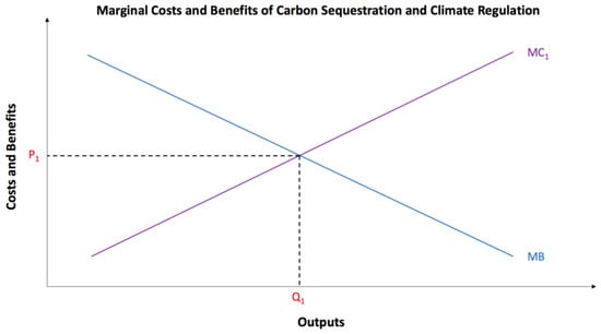 Fundamental economic analysis defines marginal costs (MC) as the costs of generating an additional good or service, while marginal benefit (MB) represents the subsequent benefits following consumption of the additional good or service. The intersection between the MB and the MC represents the optimal amount to pay for carbon sequestration and climate regulation, otherwise known as climate control costs. In Figure 5, MC1 represents the marginal costs if the value of SIC stocks based on the SC-CO2 are not identified. The optimal amount to pay for climate control costs if the value of SIC stocks based on the SC-CO2 are not identified is represented at the intersection of MC1 and MB. The optimal amount means that P1 is the optimal price to pay for climate control at the optimal quantity of Q1 (Figure 5).