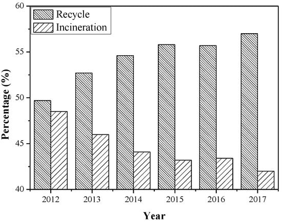| Year | MSW Recycled | Incineration | Sanitary Landfill | Sum | |||