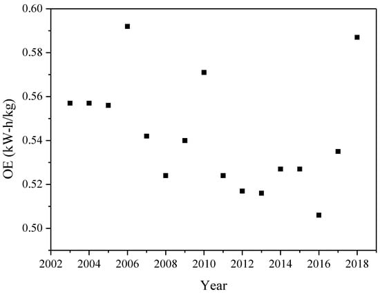 | P 2 (MW-h) | W 3 (MT) | OE 4 (kW-h/kg) | P (MW-h) | W (MT) | OE 4 (kW-h/kg) | P (MW-h) | W (MT) | OE 4 (kW-h/kg) | P (MW-h) | W (MT) | OE 4 (kW-h/kg) | |