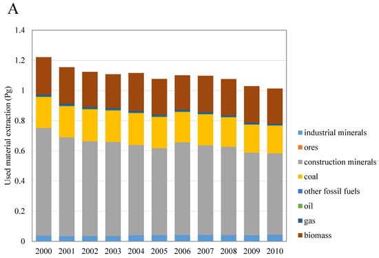 Results from the top-down methodology show that over time extraction had a slight decrease, going from about 1.2 Pg in 2000 to 1.0 Pg in 2010 (Figure 2A) (note: 1 Pg = 1015 g = 1 Gt). From 2000 to 2010, the total cumulative mass of used material extraction of Germany was 12.1 Pg, while the total cumulative mass of industrial minerals, ores, construction minerals, and coal reached 9.32 Pg. The first largest extracted material, namely construction minerals, occupied a constant share, approximately 60%, for the whole duration of our period of study. After construction minerals, the second largest extracted material was coal, which accounted for about 200 Tg in each year. The remainder of the DE consists of industrial minerals, ores, other fossil fuels, oil, gas, other biomass, biomass forestry, biomass food, biomass feed, and biomass animals.