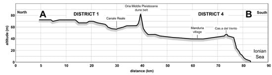 Murge Tarantine ridge by the remains of an undulating palaeosurface showing a number of low dome-shaped reliefs whose elevation is comprised between 124 m, to the west, and 100 m to the east (