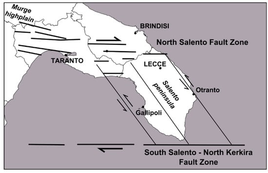 14], the North Salento Fault Zone, a dextral strike-slip fault of regional importance (