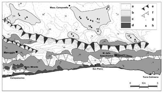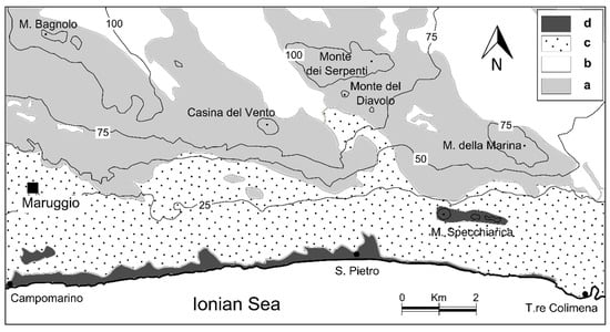 Relict dune belts are associated to marine terraces. They have been found at Specchiarica locality, where the maximum altitude of 27 m is reached, and near Mass. Mirante locality (19 m).