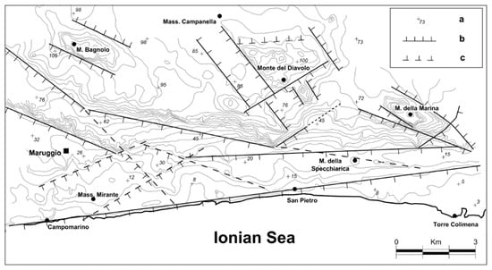 The other two systems are easily recognizable on the Murge Tarantine ridge, whereas they are less evident on the low elevated coastal area. The second system comprises NW–SE and NE–SW fault scarps which produce horst and graben structures in the area closest to the Monte del Diavolo relief. The last system, showing WNW–ESE- and WSW–ENE-oriented faults, is responsible for the development of horst structures (Monte Bagnolo and Monte della Marina) and indents the main complex tectonic scarp which locally divides the coastal plain from the Murge Tarantine top surface. Fault scarps belonging to the E–W tectonic alignment clearly cuts the other two fault scarp systems producing the main features of the landscape. They are most likely the most evident morphological effects of North Salento Fault Zone occurring in the region.