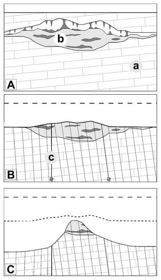 Breccias originate due to the collapse of gypsiferous beds and other rocks into cavities formed within deep-seated gypsum beds. Such