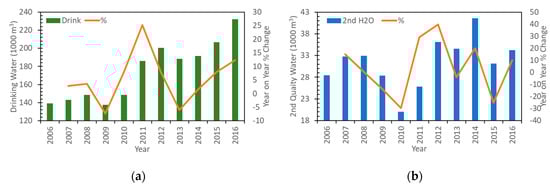 (a): Total Annual Drinking Water Consumption (Cubic Metres m3) and Year-on-Year Change (%) and (b): Total Annual Second Quality Water Consumption (Cubic Metres m3) and Year-on-Year Change (%). Source: data derived from [51,71,72].