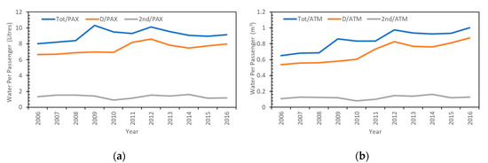 (a): Water Consumption Per Passenger and (b): Water Consumption Per Aircraft Movement, for total, drinking, and second quality water. Source: data derived from [51,71,72].