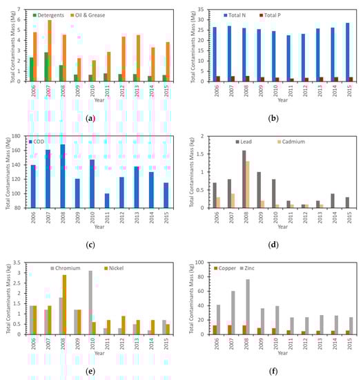 Most countries have set water quality standards. However, the water quality standards set by airports are normally much more stringent [32]. Around the world, the organic water pollution indicators that are commonly used to measure water pollution are chemical oxygen demand (COD), total nitrogen (T-N), and total phosphorous (T-P) [38]. The chemical oxygen demand (COD) test measures the total amount of oxygen that is required to completely oxidize organic matter to carbon dioxide (CO2) and water. Hence, the COD test provides an indication of its potential maximum oxygen demand [39,40].