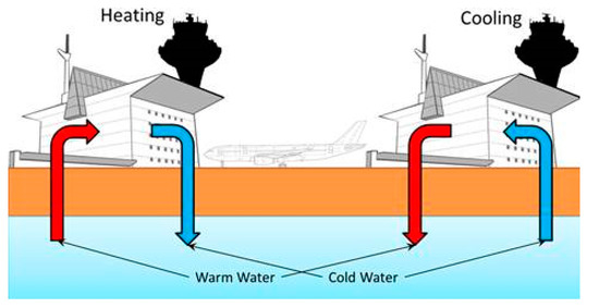 - Københavns Lufthavne A/S. ATES Ground Water Cooling (Aquifer Thermal Energy Storage); Københavns Lufthavne A/S: Copenhagen, Denmark, 2019. [Google Scholar]