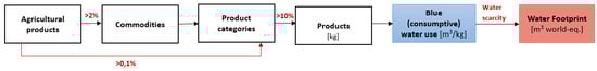 Methodology followed for the water scarcity footprint (WSF) calculation. Red numbers indicate the applied cut-offs for the import-mix (adapted from Finogenova et al. [15]).