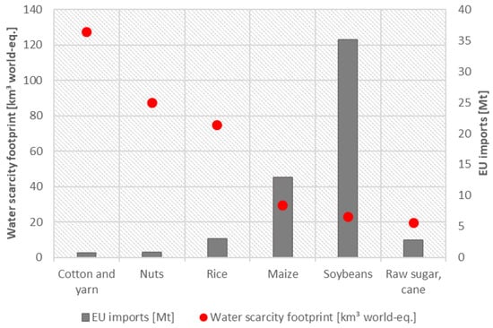 This can be explained by the fact, that these products are water intensive and grown in water-scarce countries, which leads to high irrigation requirements. Cotton comes to the EU mainly from Turkey, Egypt, India and Pakistan, which are countries with high regional water scarcity [18]. Nuts for EU consumption are produced primarily in the US, Turkey and Vietnam, which have areas of moderate to high water scarcity and where blue water availability varies seasonally [18].