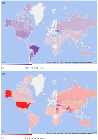 The total blue water consumption per product i in a country j (CWUi,j, in m3) was calculated by multiplying the mass-specific cwui,j (m3/kg) by the total mass of the imports Ii,j (kg) from this country to the EU, as shown in Equation (1):