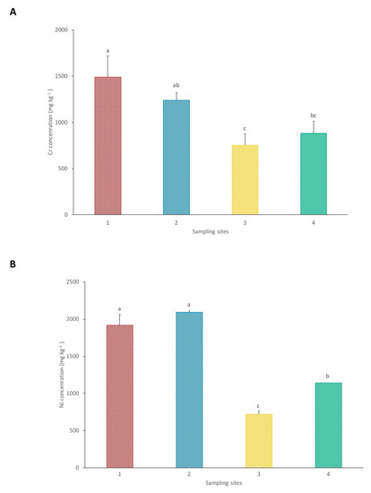The results of the pseudo total concentrations of Cr and Ni in the soil from each sampling site are presented in Figure 2. Chromium concentrations are significantly lower in site 3 in comparison with the other sites, with a mean value of 753 mg kg−1. Sampling site 1 presents a significantly higher Cr concentration in relation to site 4, with 1491 and 881 mg kg−1, respectively. The results from site 2, with a mean of 1240 mg kg−1, do not show significant differences in comparison to sites 1 and 4.