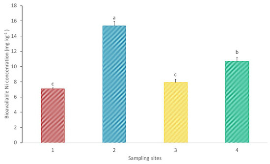 Bioavailable Ni concentrations in the soils from each sampling site. Each value represents the mean of three replicate measurements ± SD. Different letters indicate significant differences between sites at p < 0.05.
