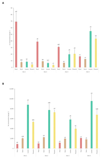 Cr (A) and Ni (B) concentrations in the different plant tissues from each sampling site. Each value represents the mean of three replicate measurements ± SD. Different lowercase letters indicate significant differences between different plant parts for each point; different uppercase letters indicate significant differences between sampling sites for each plant part, p < 0.05.