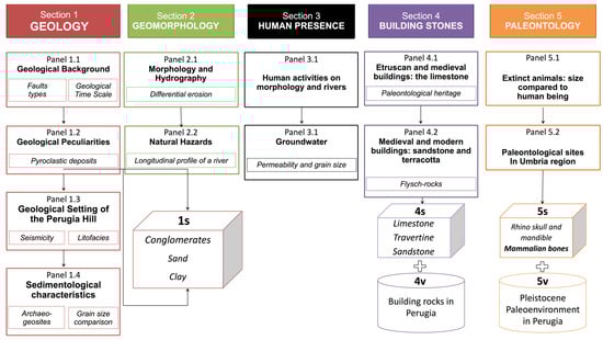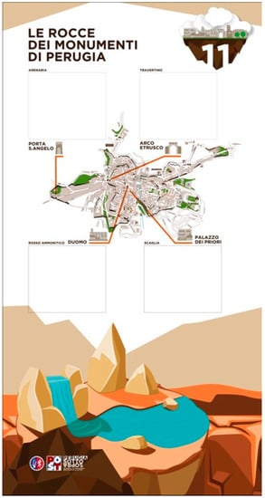 Figure 5), each one devoted to a particular aspect of urban geology present in Perugia with a theoretical scheme following an initial introduction to the geological history and then moving toward some more particular aspects.