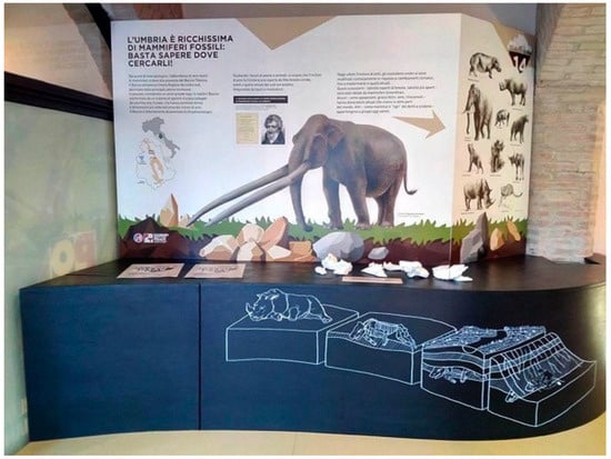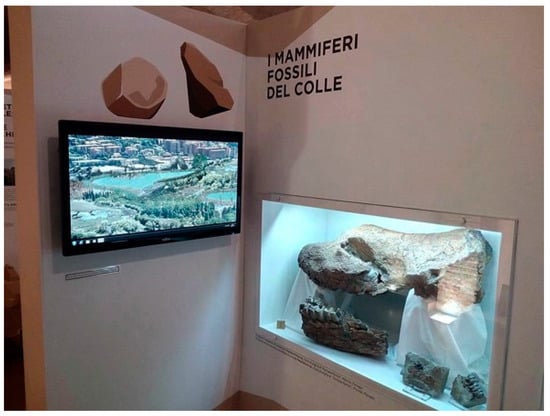 Figure 8). One of the most important results of the exhibition was to show for the first time the mammal fossils (Pliocene and Pleistocene) discovered in the past century on the Perugia hill, with a well-preserved rhino skull usually not visible to the public. In this section, a video was present too (