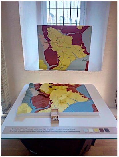 Figure 11). The first step was to extract some contour lines from a digital elevation model of the hill of Perugia (cell size 5 × 5 m). Then the polygons of the geological complexes were overlaid. Finally, only for the downtown area, the polygons of the watersheds are added where the drainage divide of the main rivers flowing on the city center converges. A 3D printer, analyzing the vector data, created the plastic model of the Perugia hill and surrounding area. Different colors were associated with the geological complexes while the plastic was cut along some boundaries corresponding to the limits between different lithological complexes or along drainage divides. Then some labels were available to be added to the puzzle and to identify the symbolic places of the city. In order to help the visitors, a poster in front of the plastic model was present with the names of the places printed on the labels.