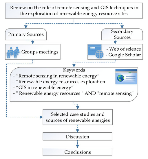 The flowchart of the review study was shown in Figure 2. The case studies were identified based on the potential application of remote sensing in exploring and estimation of renewable energy related to wind, solar, hydropower, geothermal and biomass resources in the context of economic and social dimensions. We noted that the literature review, the latest work in the Asian region and other countries were obtained. The primary and secondary sources of data were used for this review. A database of published articles on the role of remote sensing and GIS techniques in the exploration of renewable energy resource sites was established using the web of science and Google Scholar because of the useful multidisciplinary database. Group discussion was conducted two times among scientists and stakeholders, the first time in deciding types of renewable energy and selecting case studies. Keywords such as “remote sensing in renewable energy”, “renewable energy resources exploration”, “GIS in renewable energy”, “renewable energy resources” and “remote sensing” and “GIS” were chosen as search terms. The results obtained using these keywords were 3, 9, 23 and 1230 respectively. A lot of attention has also been given on the policy related research articles to identify the application of remote sensing and GIS in renewable energy management. To obtain a large range of relevant articles, we have added papers relating to resource management, energy production, and energy reports. After adding these papers, we have omitted irrelevant papers from the collection by going through the abstracts, discussion, and conclusions. To understand the main focus of papers in the field of applications and the role of remote sensing and GIS techniques in renewable energy resources, the selected set of papers were read judiciously several times. After that, the main findings of each of the paper were noted down along with their research scale, adopted methods, the illustration of concepts and their limitations.
