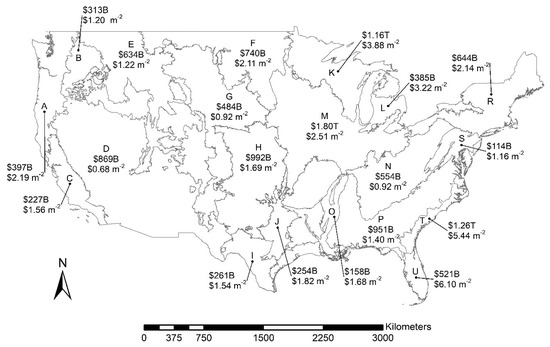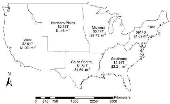 States with the highest total SOC storage value were: (1) Texas ($1.08T), (2) Minnesota ($834B), and (3) Florida ($742B) (Figure 2, Table 7). The value of SOC based on area density within state boundaries were ranked: (1) Florida ($5.44 m−2), (2) Delaware ($4.10 m−2), and (3) Minnesota ($3.99 m−2) (Table 7, Figure 2). The regions with the highest total SOC storage value were: (1) Midwest ($3.17T), (2) Southeast ($2.44T), and (3) Northern Plains ($2.35T) (Table 7, Figure 3). The value of SOC based on area density within regions boundaries were ranked: (1) Midwest ($2.73 m−2), (2) Southeast ($2.31 m−2), and (3) East ($1.82 m−2) (Table 7, Figure 2).