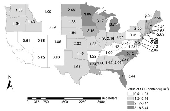 The objective of this study was to assess the value of SOC in the contiguous U.S. using the social cost of carbon (SC-CO2) and avoided emissions provided by carbon sequestration. This study provides the monetary values of SOC by soil depth (0–20, 20–100, 100–200 cm) across the contiguous U.S. and by considering different spatial aggregation levels (i.e., state, region, land resource region (LRR)) using information previously reported by Guo et al. (2006) [11], who estimated the inventory of SOC for the conterminous U.S. using the State Soil Geographic (STATSGO).