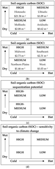Sustainable SOC management is an important economic issue because SOC is critical for food production, but it also provides a regulating service, which can be valued based on the avoided social cost of carbon emissions. Much of the original levels of SOC has been lost to the atmosphere through the original conversion of “native” grasslands and forests to agricultural land, which globally has caused a loss of SOC between 20–60% [12,13,14]. North American farmland has lost about half of its original content of SOM [15]. Our study is based on more recent soil inventories, which represent the SOC status after this original loss. We have estimated a monetary value for SOC, based on SC-CO2 and the avoided emissions/damages that are gained by sequestration of CO2 from the atmosphere in the contiguous U.S. by soil order, soil depth, land resource region (LRR), state, and region using information from the State Soil Geographic (STATSGO) database. Climate, soil type, and geographic location impact the SOC values for the SC-CO2 (Figure 4). The SOC values for the SC-CO2 are decreasing with the increase in temperature and dryness (Figure 4).