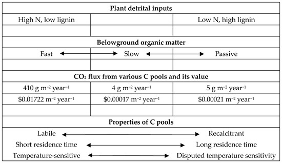 Properties of soil organic carbon (SOC) pools (CENTURY model), and values of CO2 fluxes based on the avoided SC-CO2 of $42 per metric ton of CO2, and SOC sequestration potential (adapted from Davidson and Janssens, 2006 [20]; Coyne and Thompson, 2006 [22]).
