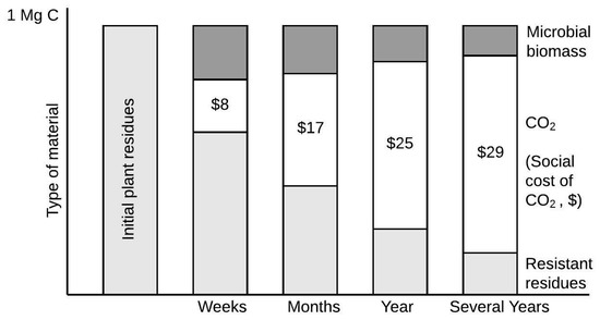Physical changes during plant residue decomposition in soil, and values of CO2 fluxes based on the avoided SC-CO2 of $42 per metric ton of CO2, and soil organic carbon (SOC) sequestration potential (adapted from Coyne and Thompson, 2006 [22]).
