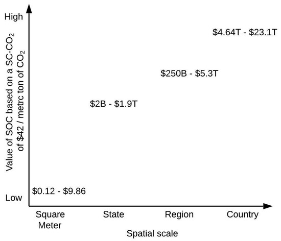 Scale and cost of soil organic carbon (SOC) midpoint values in the contiguous United States (U.S.), based on SOC numbers from Guo et al., 2006 [11] and a SC-CO2 of $42 per metric ton of CO2 (i.e., $ 2 billion U.S. dollars, where B = billion = 109; $1.9 trillion U.S. dollars, where T = trillion = 1012).
