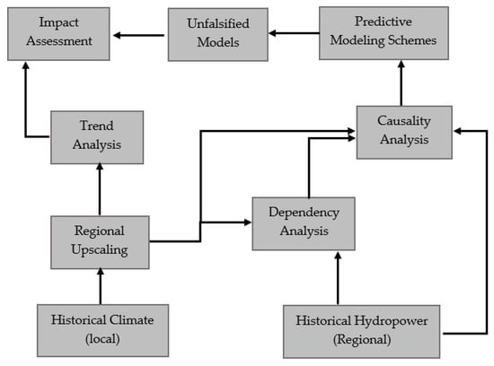 We aim at introducing a fully bottom-up scheme that can reveal expected change in hydropower production potential, if historical trends in climate variables continue in the future. Figure 1 shows a schematic view to the proposed framework. The procedure starts with estimating regional climate variables based on a number of in situ climate measurements. We then use a statistical trend test to investigate monotonic changes in regional climate variables across monthly, seasonal, and annual scales. In parallel, we use two other statistical tests to assess the dependency and casual links between lagged climate variables and hydropower production. After understanding specific climatic causes of hydropower generation at each political region, different competing hypotheses for simulating monthly hydropower generation are formed and tested to infer the best predictive model for impact assessment. We then plug the historical trends in regional climate variables to the non-falsified predictive models to portray what would be the historical hydropower production, if historical trends continue as-is in the future. Using this framework, the sensitivity of hydropower production to continuation of climatic trends can be assessed without using climate, hydrological, and energy simulation models.